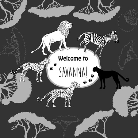 サバンナの動物背景 手描きのベクトルの木 ライオン チーター シマウマ サファリパーク ベクトル図のイラスト素材 ベクタ Image